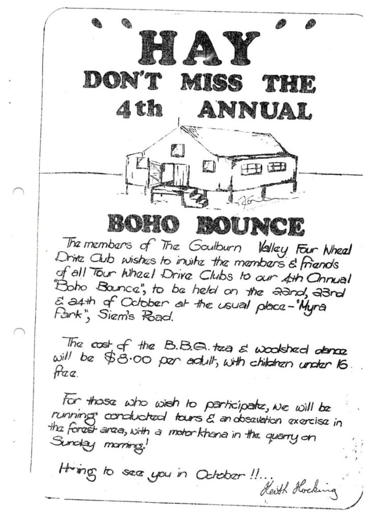 The members of The Goulburn Valley Four Wheel Drive Club wishes to invite the members & friends of all Four Wheel Drive Clubs to our 4th Annual “Boho Bounce”, to be held on the 22nd, 23rd & 24th of October at the usual place – “Myra Park”, Siem’s Road.